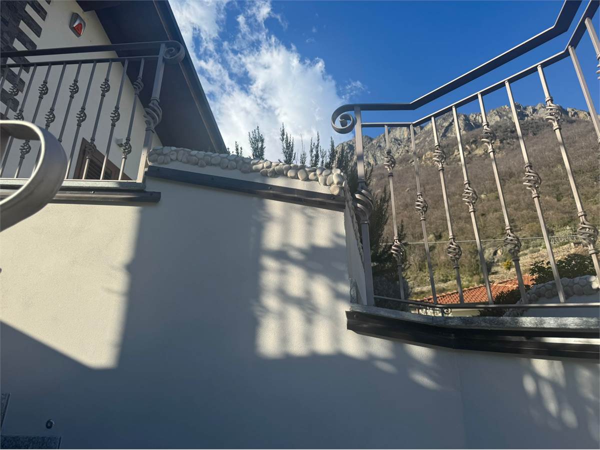 Al primo piano, con accesso da scalinata in pietra ornata alla base da due fantastiche fontane o da rampa appositamente studiata per problemi di deambulazione, troviamo un porticato che da sull'ingresso. Entriamo direttamente nel soggiorno con caminetto a seguire la cucina con penisola e ampie porte vetrate per accedere al balcone che si sviluppa su tutto il lato della villa. Il soffitto con travi a vista di legno massiccio apportano un'atmosfera calda e accogliente. Seguendo troviamo un vano adibito a palestra, bagno, lavanderia, due camere matrimoniali di cui una dotata di bagno privato con vasca idromassaggio e cabina armadio.